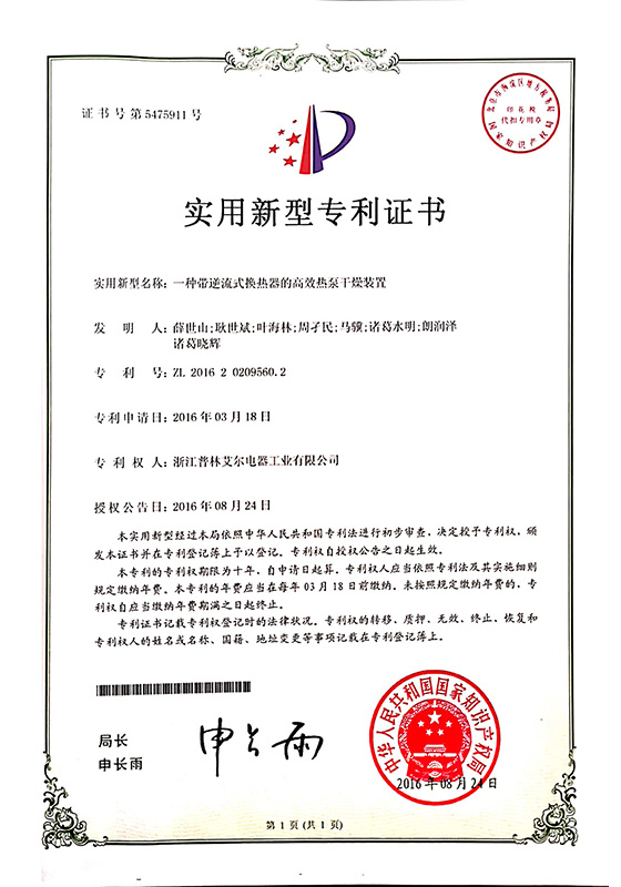 2015年一種加熱啟動并且重熱負荷運行的高溫熱泵干燥機實用新型專利證書
