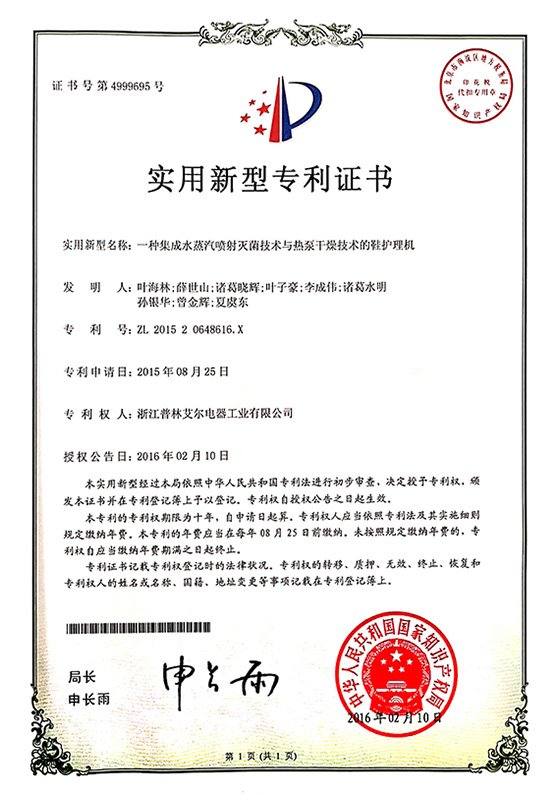 2016年一種集成水蒸汽噴射滅菌技術與熱泵干燥技術的鞋護理機實用新型專利證書