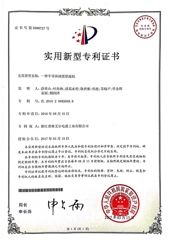 2017年雙風機半導體深度除濕機及防霉衣柜、鞋柜、櫥柜實用新型專利證書