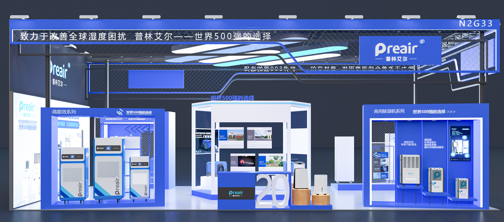 對(duì)于占比最大的兩塊燈箱海報(bào),將本次參展的全系列機(jī)型( 不包含外貿(mào)機(jī)型)靜態(tài)集中展示,配合品牌的主打廣告語和使命愿景,讓來展臺(tái)的觀眾,一下就能關(guān)注到我司的使命:普林艾爾——致力于改善全球濕度困擾。