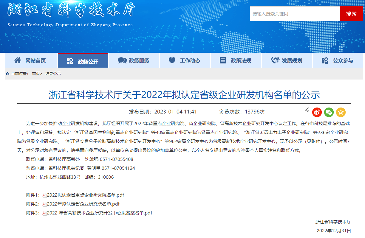 近日,浙江省科學技術廳公布了2022年省重點企業研究院、省企業研究院、省高新技術企業研究開發中心名單。